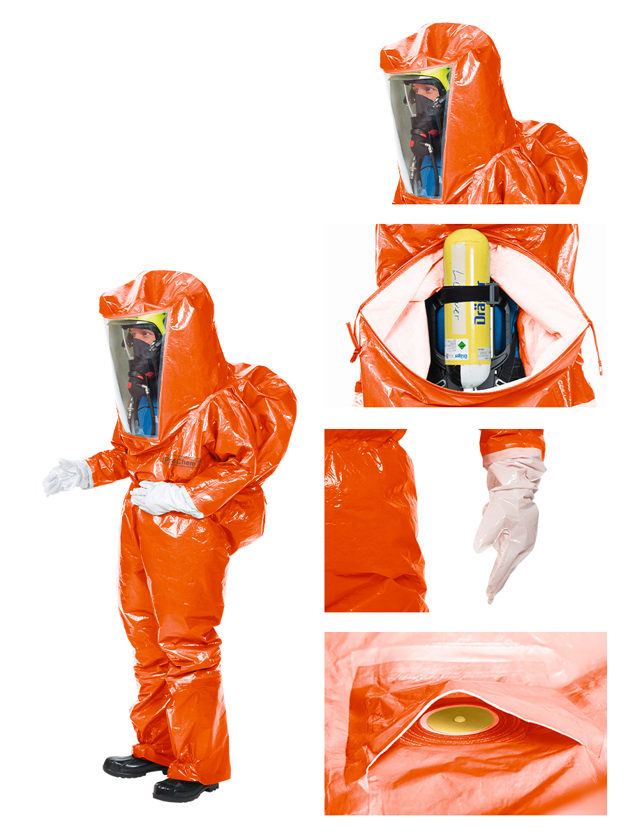 Der ProChem® V ist ein einteiliger Vollschutzoverall mit erweitertem Rückenbereich zum kontaminationsfreien Tragen eines Pressluftatmers (SCBA) innerhalb des Schutzanzuges. Zum Verschließen kommt ein Reißverschluss auf dem Rücken zum Einsatz, der ein sicheres An- und Ausziehen des Overalls ermöglicht. Das große Visier und der Raum in der Haube bieten genügend Platz für weitere Sicherheitsausrüstung wie Feuerwehrhelme und Atemschutzgeräte. Zusätzlich gewährleisten die Ausatemventile eine gute Luft- und Druckverteilung.